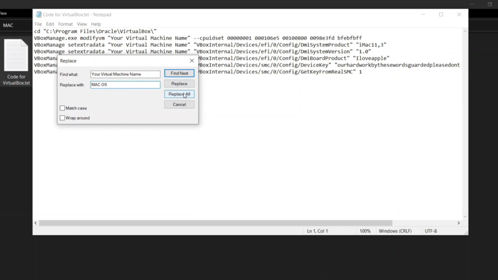 - Now in Find What Type: Your Virtual Machine Name. And in Replace with type your OS Name you have copied.