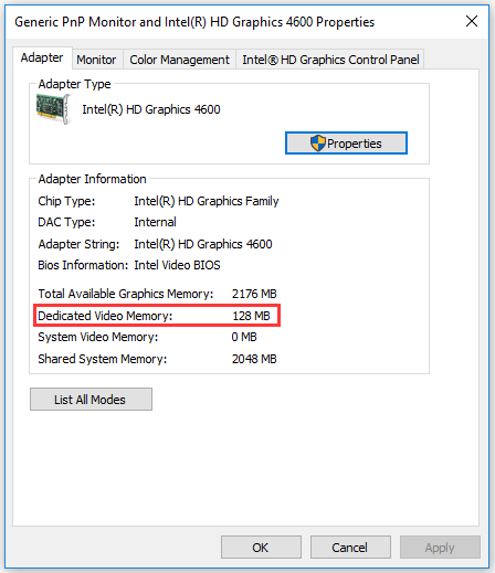 - A new window will open. Look for Dedicated Video Memory, this will show your computer’s Video RAM memory