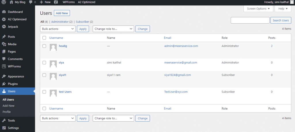To see the list of all users of your WordPress site just go to Users>>All Users then a screen will appear like this one below.